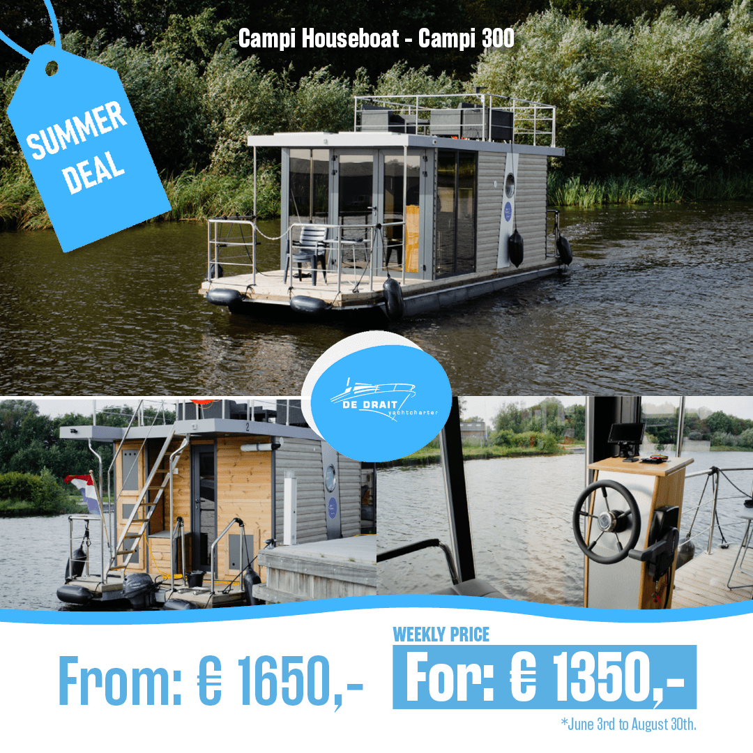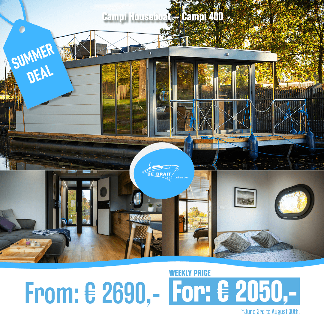 Das Campi Hausboot ist ein modernes Hausboot, mit dem Sie kurze Entfernungen zurücklegen und gleichzeitig eine gemütliche Atmosphäre genießen können.